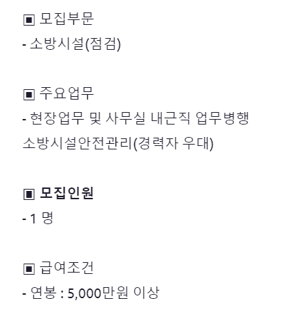 해당 사진은 소방시설관리사 모집공고 중 일부를 가지고 온 것입니다. 밑에 보시면 알겠지만 대충 연봉감이 잡히시나요? 5000만원~7000만원까지는 쉽게(?) 벌 수 있다고 합니다.