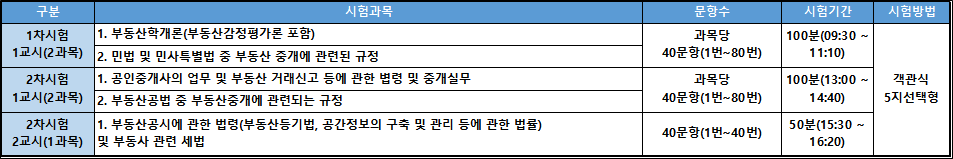 1차 시험의 경우는 1교시동안 과목당 40문항씩 총 80문항을 풀어야합니다. 과목은 '부동산학개론(부동산감정평가론 포함)', '민법 및 민사 특별법 중 부동산 중개에 관련되는 규정' 총 이렇게 2과목을 시험보게 됩니다. 시험 시간은 100분정도로 9:30부터 11:10까지 시간입니다.